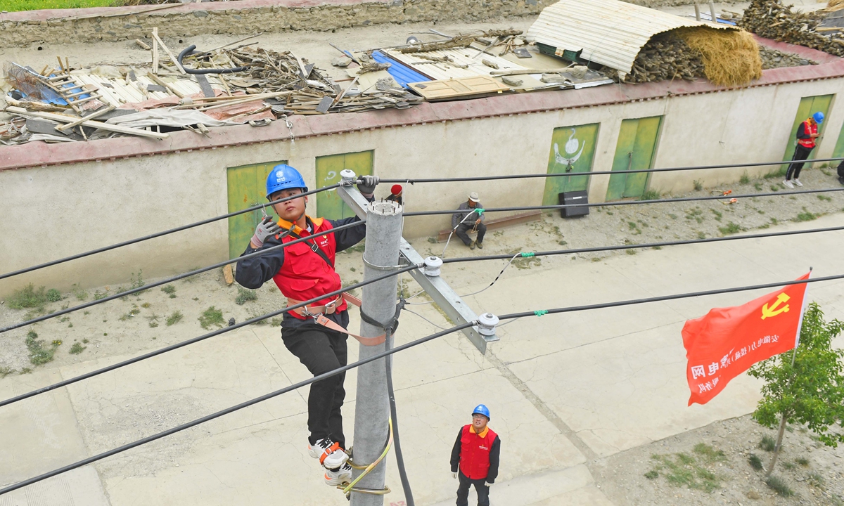 Electrical engineers, also Party members aiding Tibet, install power lines for relocated Tibetan residents on June 23. Photo: IC