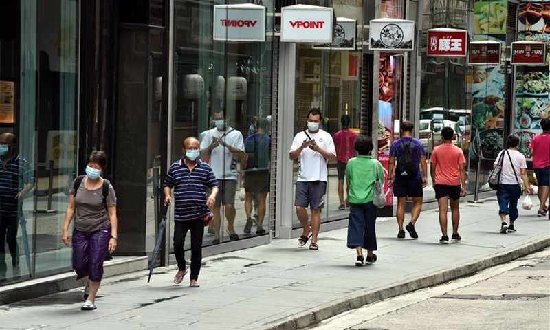 People wearing face masks walk along a street of Causeway Bay amid COVID-19 pandemic in Hong Kong, south China, Aug. 1, 2020. (Xinhua/Lo Ping Fai)