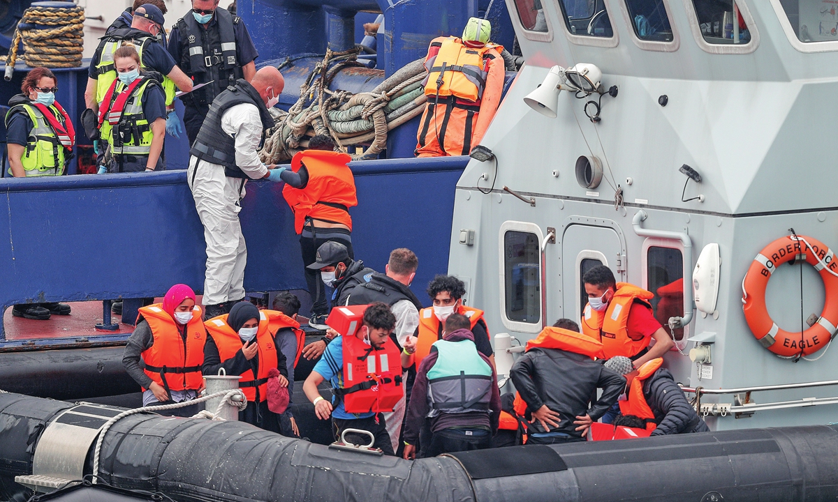 UK Border Force officials help migrants intercepted while traveling in an RIB from France to Dover disembark from their patrol vessel HMC Eagle after arriving at the Marina, in Dover, England on Wednesday. More than 4,000 migrants arrived illegally in the Britain through the Channel since the start of the year, including around 600 since August 6. Photo: AFP