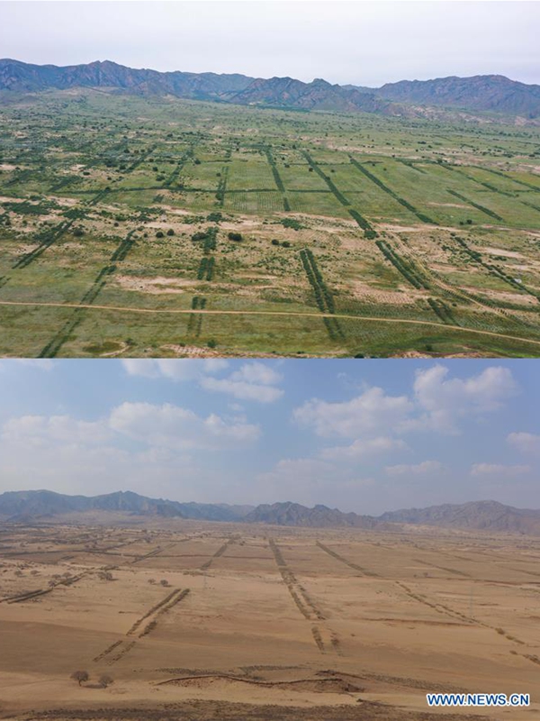 Combo photo shows an area near the Xar Moron River in Hexigten Banner, north China's Inner Mongolia Autonomous Region, after the desertification control work on Aug. 12, 2020 (top, Xinhua/Xu Qin), and before the desertification control work on April 5, 2017 (Xinhua).