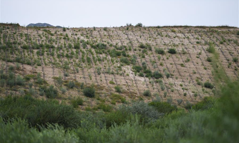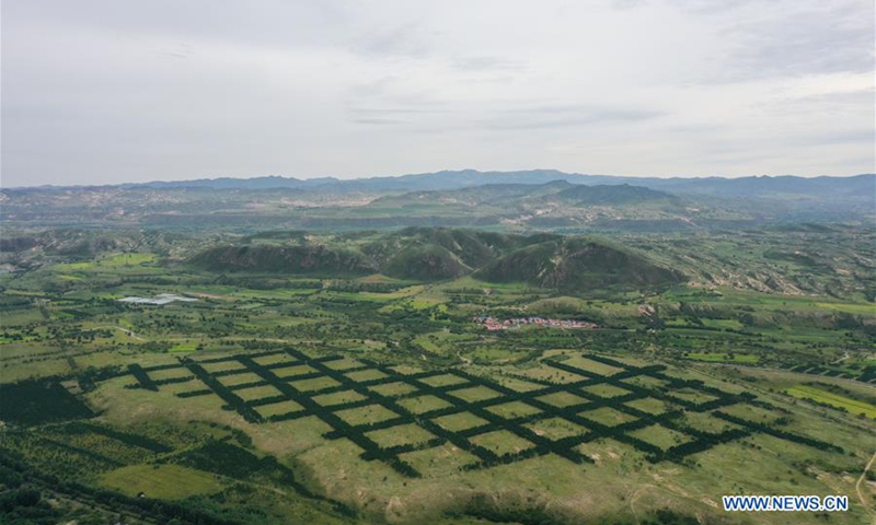 Aerial photo taken on Aug. 12, 2020 shows an area after desertification control work near the Xar Moron River in Hexigten Banner, north China's Inner Mongolia Autonomous Region. (Xinhua/Liu Lei)