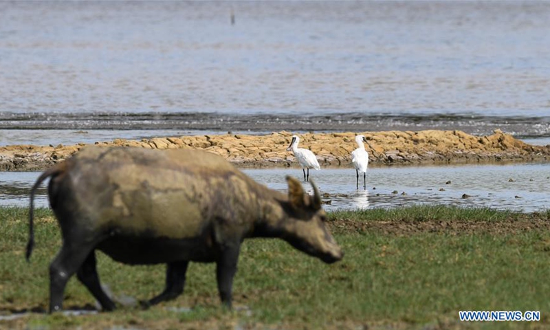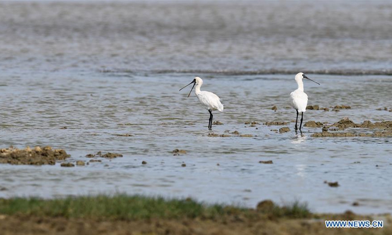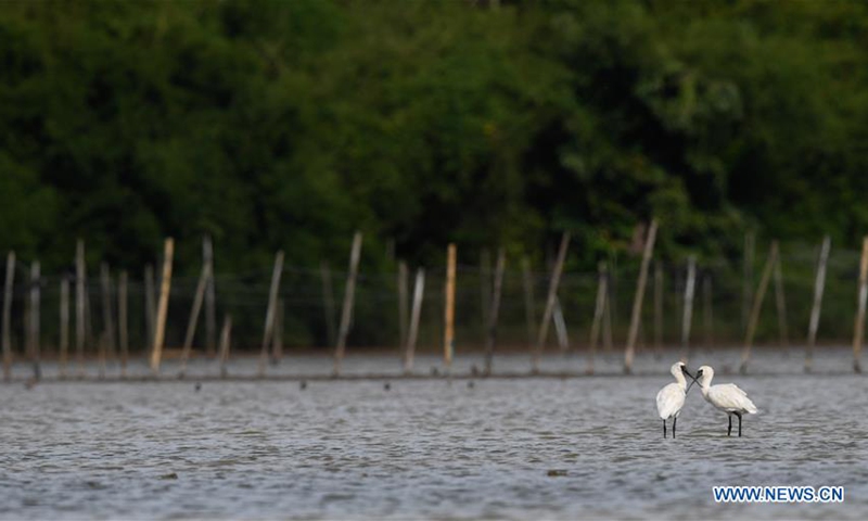 Two black-faced spoonbills are seen in a pond near the Dongzhaigang national nature reserve in Haikou, south China's Hainan Province, Aug. 12, 2020. The black-faced spoonbill is one of the most endangered birds in the world, due to its limited distribution area and extremely rare population. (Xinhua/Yang Guanyu)