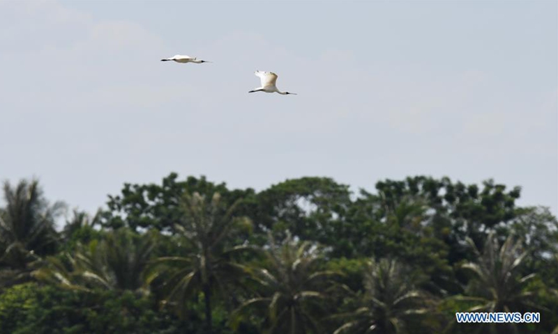 Two black-faced spoonbills fly near the Dongzhaigang national nature reserve in Haikou, south China's Hainan Province, Aug. 12, 2020. The black-faced spoonbill is one of the most endangered birds in the world, due to its limited distribution area and extremely rare population. (Xinhua/Yang Guanyu)