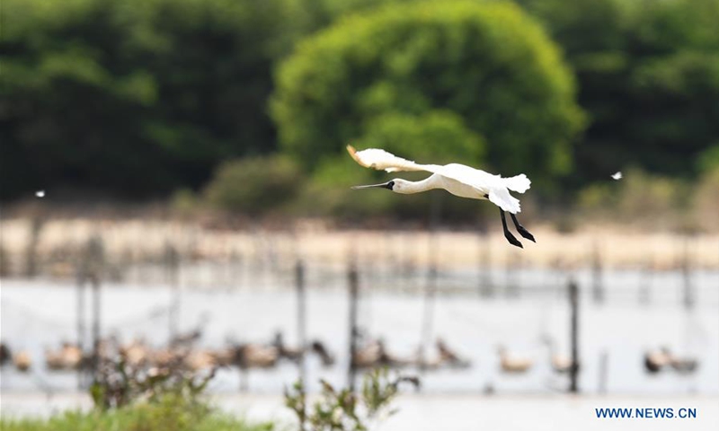 A black-faced spoonbill flies near the Dongzhaigang national nature reserve in Haikou, south China's Hainan Province, Aug. 12, 2020. The black-faced spoonbill is one of the most endangered birds in the world, due to its limited distribution area and extremely rare population. (Xinhua/Yang Guanyu)