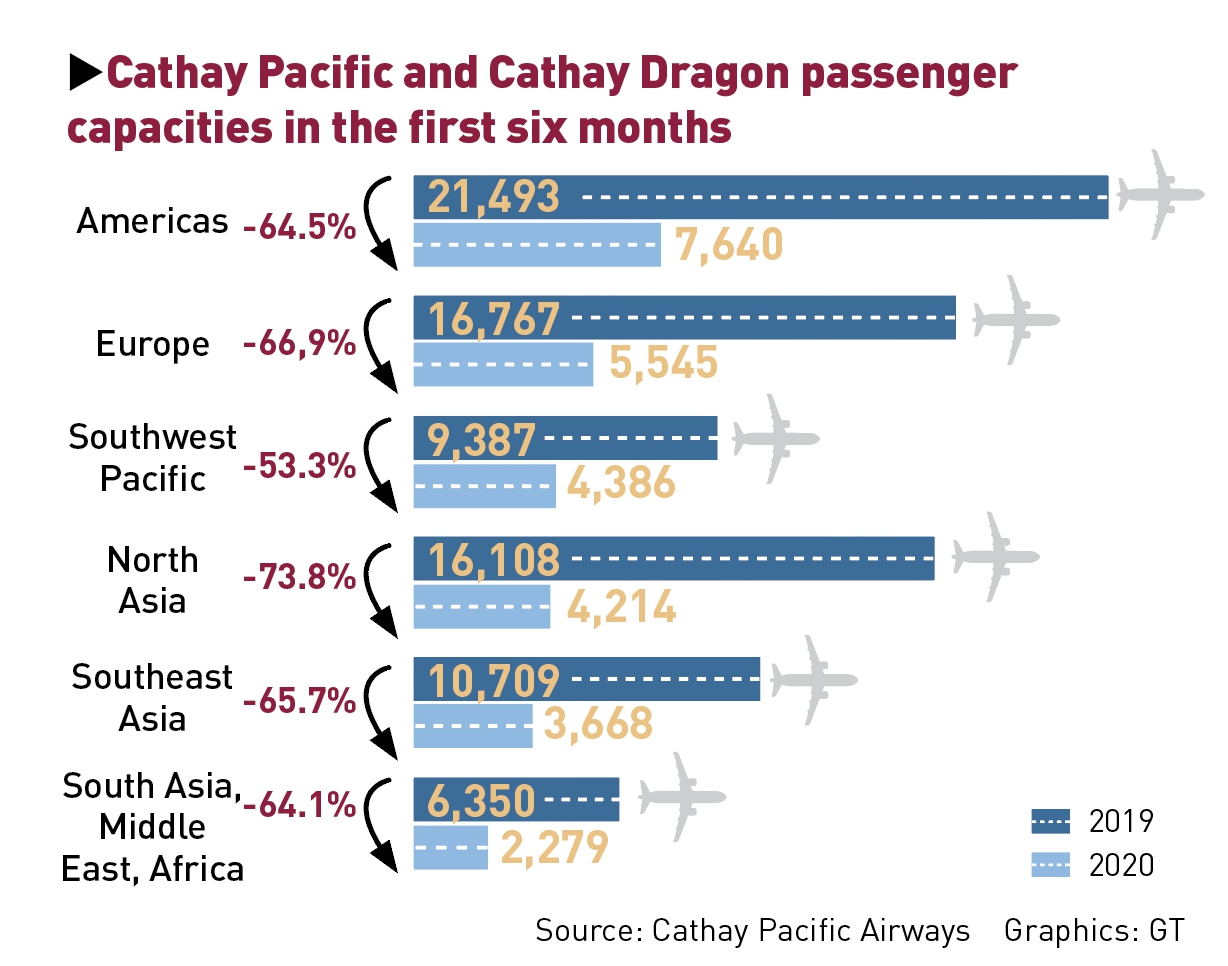 Cathay Pacific Group said on Wednesday that its attributable loss was HK$9.87 billion ($1.27 billion) in the first half of 2020, compared with a profit of HK$1.3 billion in the same period the previous year. Both Cathay Pacific and Cathay Dragon reported after-tax losses of HK$7.3 billion in the first half of 2020, down from profits of HK$675 million in the first half of 2019.