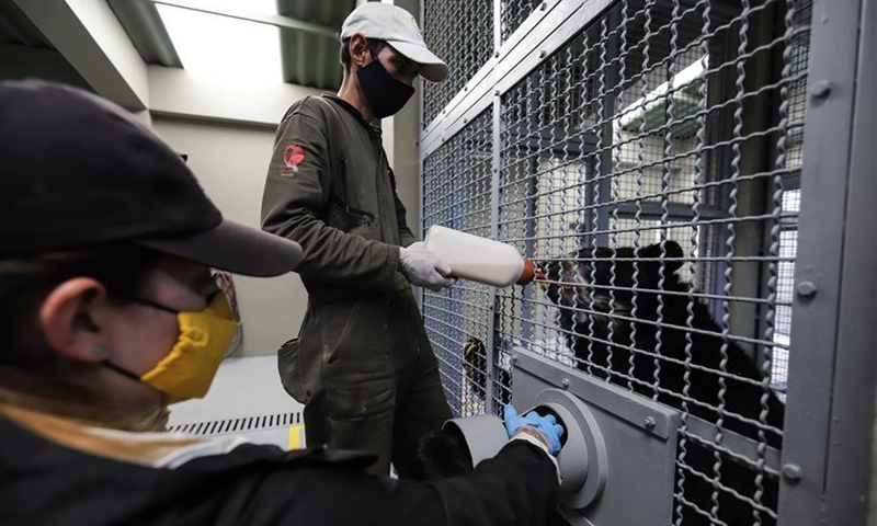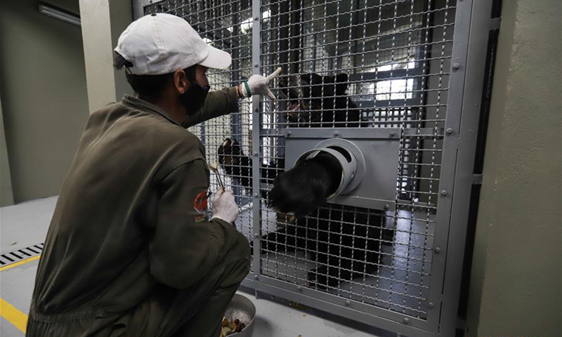 Zookeepers feed a spectacled bear at the Jaime Duque Park in Tocancipa, Cundinamarca Department, Colombia, Aug. 12, 2020. Affected by the COVID-19 outbreak, the zoo has been closed for months. (Photo by Jhon Paz/Xinhua)