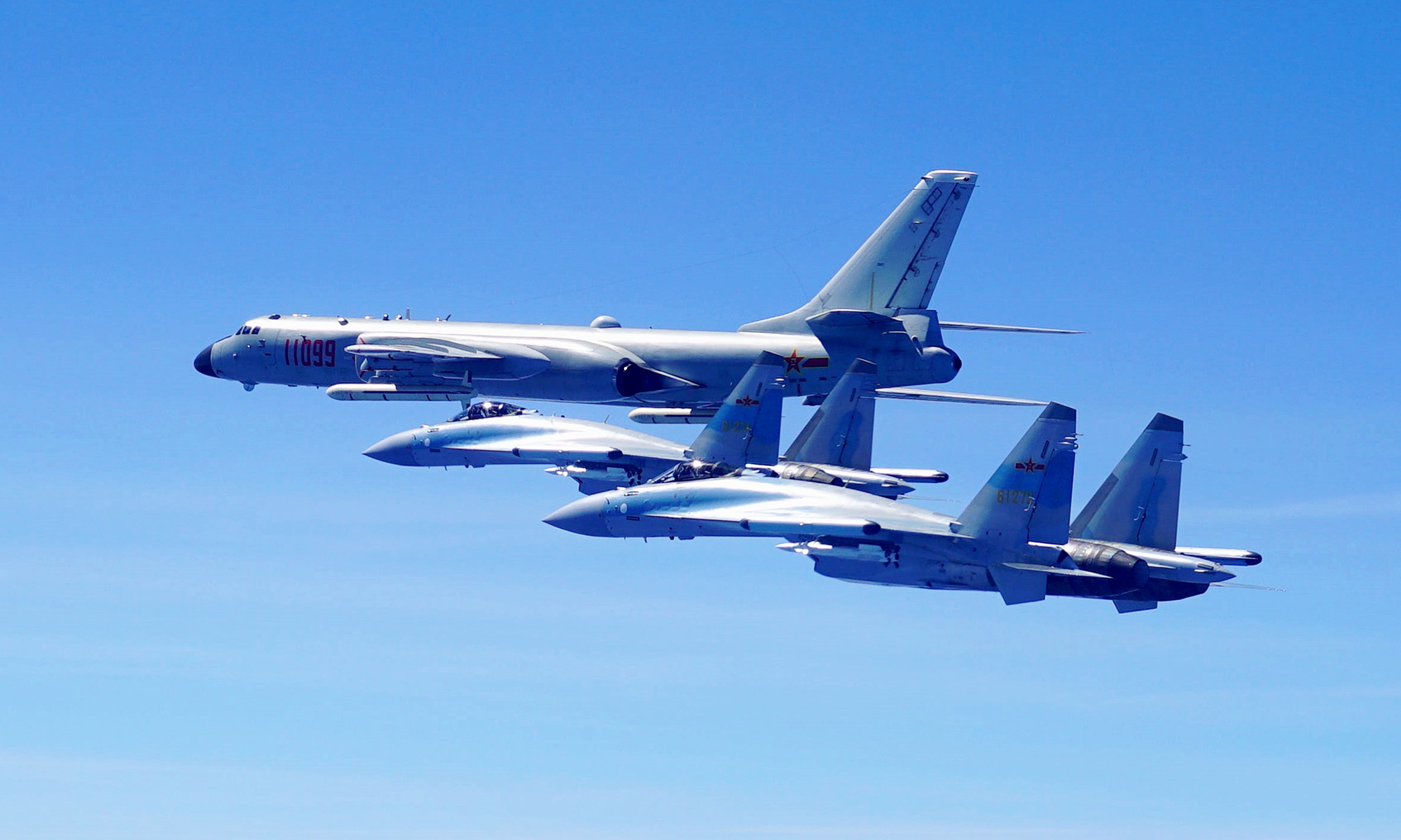 Two Su-35 fighter jets and an H-6K bomber fly in formation on May 11, 2018. The People's Liberation Army (PLA) air force conducted patrol training over China's island of Taiwan. (Xinhua)