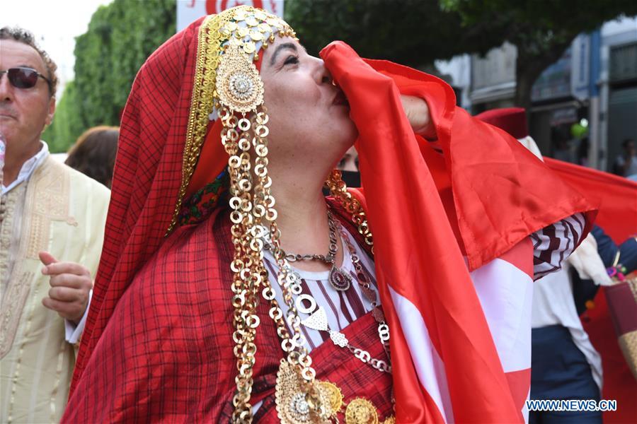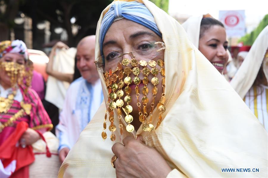 A woman in Tunisian folk costumes attends celebrations of the annual National Women's Day in downtown Tunis, Tunisia, Aug. 13, 2020. (Photo by Adel Ezzine/Xinhua)