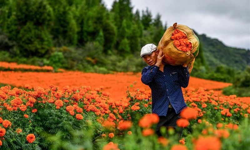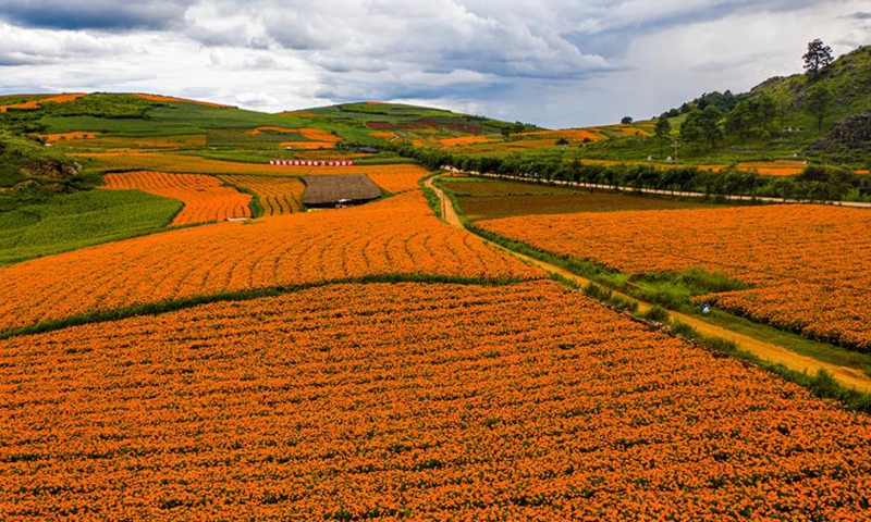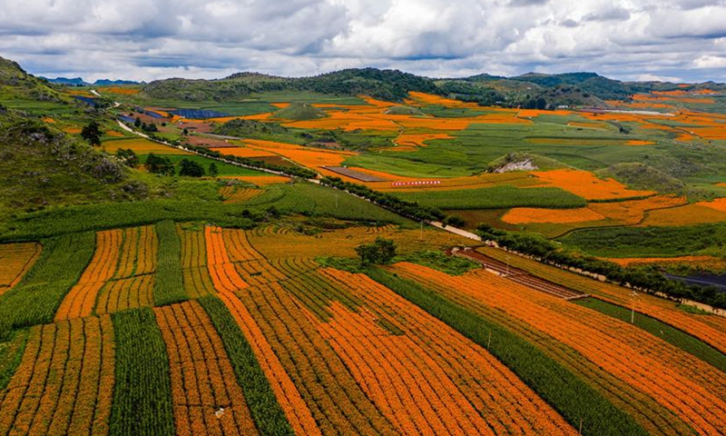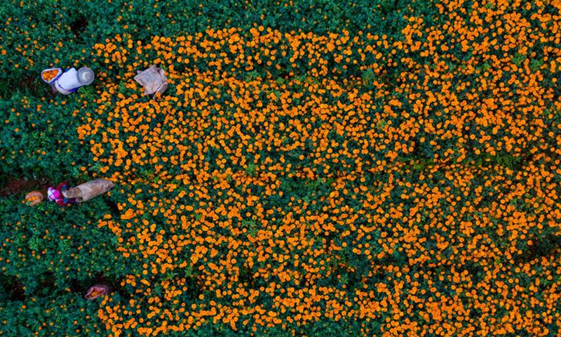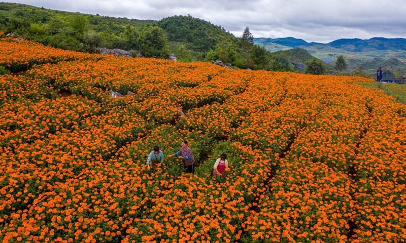 Aerial photo taken on Aug. 13, 2020 shows farmers picking marigold flowers in Qiubei County, southwest China's Yunnan Province. Covering an area of 103,000 mu (about 6,867 hectares), the planting of marigold have benefited a total of 13,000 local households with an average income increase of 12,000 yuan (about 1,727 U.S. dollars) per household.Photo:Xinhua
