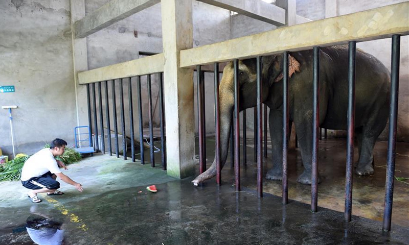 A staff member feeds an elephant with watermelon at Hefei Wildlife Park in Hefei, east China's Anhui Province, Aug. 14, 2020. The wildlife park has taken various measures to help animals fend off the summer heat in recent days.Photo:Xinhua