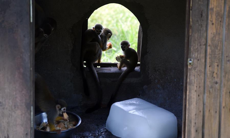 Monkeys eat fruits beside a block of ice at Hefei Wildlife Park in Hefei, east China's Anhui Province, Aug. 14, 2020. The wildlife park has taken various measures to help animals fend off the summer heat in recent days.Photo:Xinhua