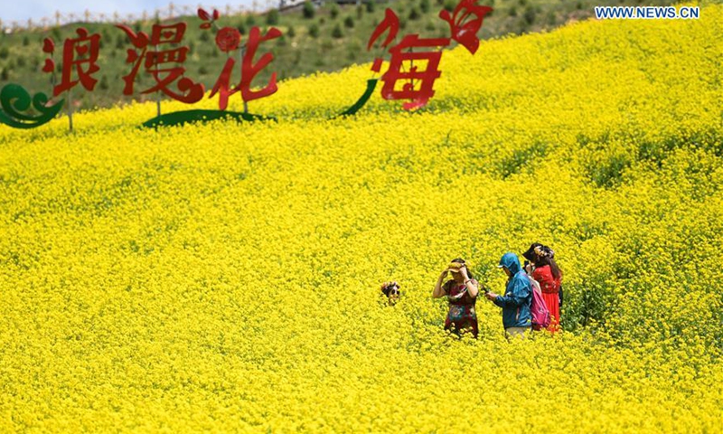 Tourist take photos amid cole flowers in Menyuan Hui Autonomous County, northwest China's Qinghai Province, July 22, 2020.Photo:Xinhua