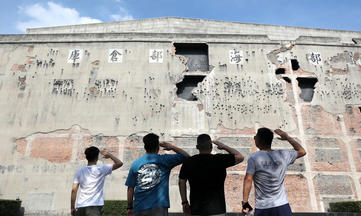 Shanghai residents salute a memorial wall of the Sihang Warehouse on Friday, where Chinese soldiers defended against the invading Japanese army, to remember the 75th anniversary of Japan's surrender in World War II on Saturday. Photo: Yang Hui/GT