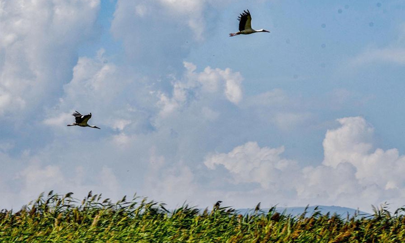 Birds fly over Prespa lake, Northern Macedonia, August 15, 2020. According to MES (Macedonian Ecological Society), Prespa Lake is a place for migrating birds to rest on their way to warmer regions in Albania, Greece and Montenegro. (Photo by Tomislav Georgiev/Xinhua)