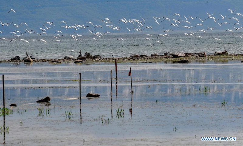 Birds are seen near the shoreline of Prespa lake, North Macedonia, Aug. 15, 2020. According to MES (Macedonian Ecological Society), Prespa Lake is a place for migrating birds to rest on their way to warmer regions in Albania, Greece and Montenegro. (Photo by Tomislav Georgiev/Xinhua)