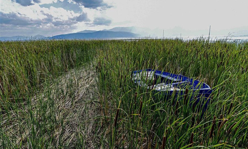 A boat is seen at shoreline of Prespa Lake, North Macedonia, Aug. 15, 2020. According to MES (Macedonian Ecological Society), Prespa Lake is a place for migrating birds to rest on their way to warmer regions in Albania, Greece and Montenegro. (Photo by Tomislav Georgiev/Xinhua)