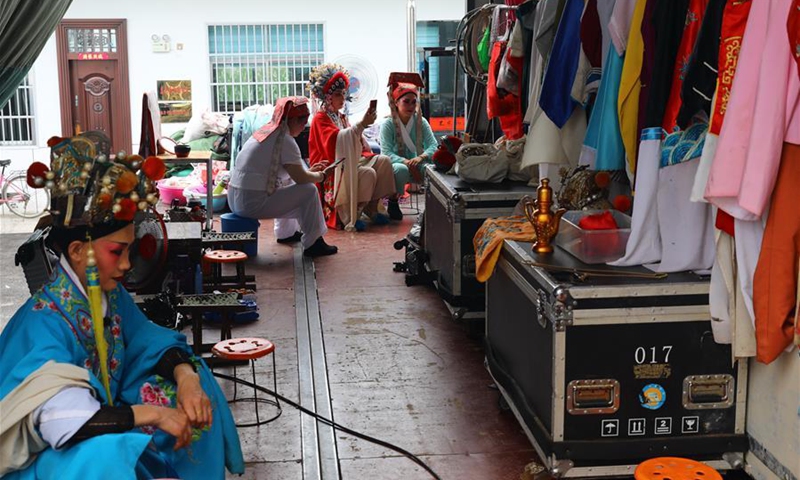 Members of a traditional Yu Opera troupe have a rest at the backstage in Zhaoyuan Village of Shuangduiji Township, east China's Anhui Province, Aug. 15, 2020. The local Yu Opera troupe formed by 25 villagers tours among villages of Nanping and Shuangdui Townships to entertain the villagers with live performances. (Photo by Wan Shanchao/Xinhua)