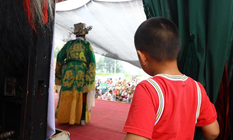 Ma Xinhua, member of a traditional Yu Opera troupe, performs at the stage as his grandson watches at the backstage in Zhaoyuan Village of Shuangduiji Township, east China's Anhui Province, Aug. 15, 2020. The local Yu Opera troupe formed by 25 villagers tours among villages of Nanping and Shuangdui Townships to entertain the villagers with live performances. (Photo by Wan Shanchao/Xinhua)