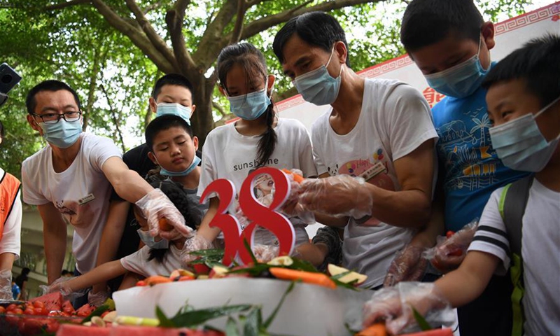 People make a special birthday cake for giant panda Xinxing at the Chongqing Zoo in southwest China's Chongqing Municipality, Aug. 16, 2020. The zoo's celebrity "granny panda" turned 38 on Sunday, equivalent to 110-150 human years. (Xinhua/Tang Yi)