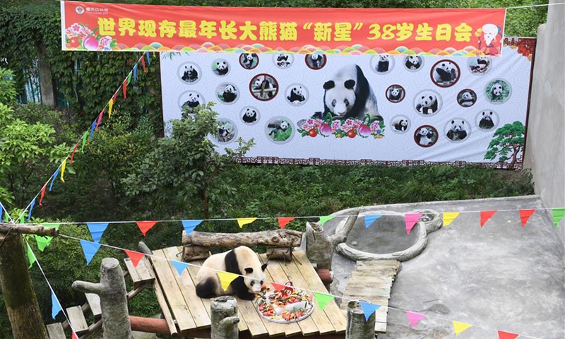 Giant panda Xinxing enjoys her special birthday cake at the Chongqing Zoo in southwest China's Chongqing Municipality, Aug. 16, 2020. The zoo's celebrity "granny panda" turned 38 on Sunday, equivalent to 110-150 human years. (Xinhua/Tang Yi)