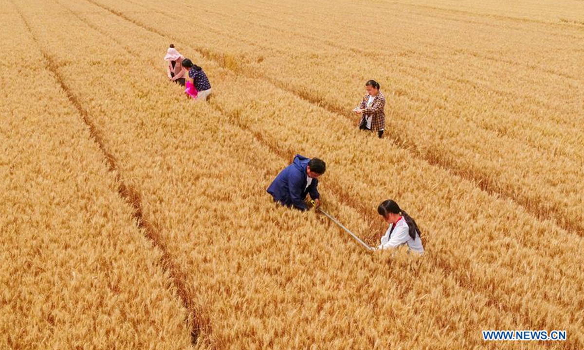 Aerial photo taken on June 2, 2020 shows agricultural technicians conducting yield monitoring at a wheat field in Xidiqiu village of Linzhang county, Handan, North China's Hebei Province. Photo: Xinhua