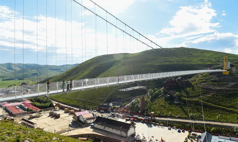 Tourists walk on a glass suspension bridge at Hongshiya national scenic spot in Zhuozi County, Ulanqab, north China's Inner Mongolia Autonomous Region, Aug. 15, 2020. (Xinhua/Peng Yuan)