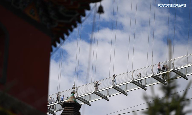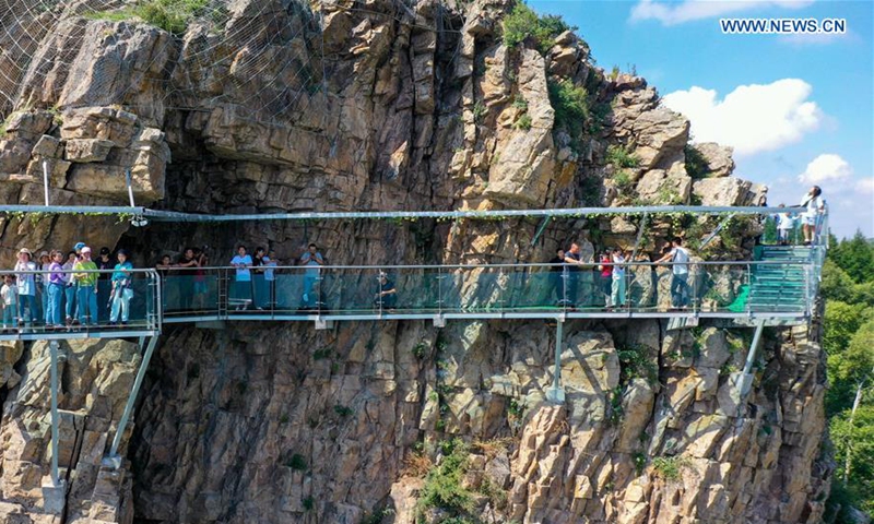 Tourists walk on a glass trestle at Jiulongwan scenic spot in Zhuozi County, Ulanqab, north China's Inner Mongolia Autonomous Region, Aug. 16, 2020. (Xinhua/Peng Yuan)