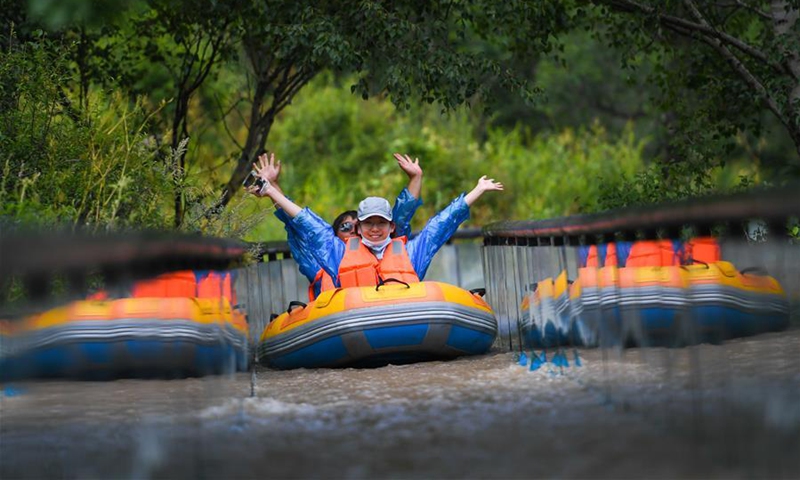 Tourists experience rafting on the river at Jiulongwan scenic spot in Zhuozi County, Ulanqab, north China's Inner Mongolia Autonomous Region, Aug. 16, 2020. (Xinhua/Peng Yuan)