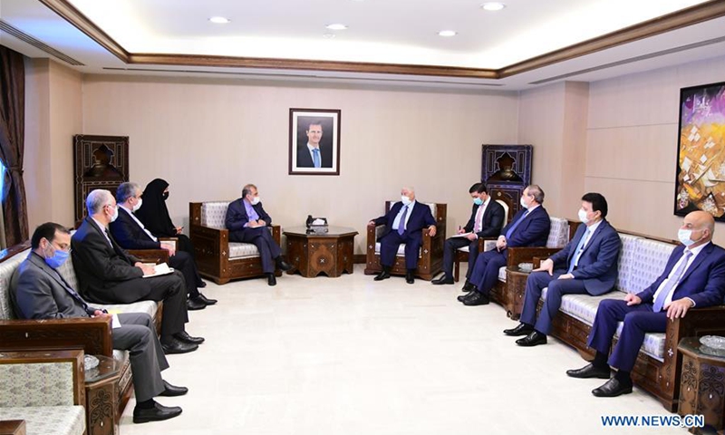 Syrian Foreign Minister Walid al-Moallem (R, Center) meets with visiting Ali Asghar Khaji (L, Center), senior assistant to the Iranian foreign minister, in Damascus, capital of Syria, on Aug. 17, 2020. The two officials highlighted on Monday the rapid development in the strategic relations between the two countries. (Photo by Ammar Safarjalani/Xinhua)