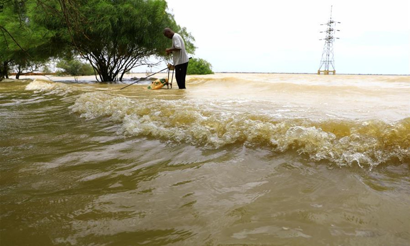 A fisherman is seen in a flooded area on the bank of the White Nile in Khartoum, Sudan, on Aug. 17, 2020. A total of 63 people have been killed due to the torrential rains hit Sudan, the country's National Council for Civil Defense said on Sunday. (Photo by Mohamed Khidir/Xinhua)