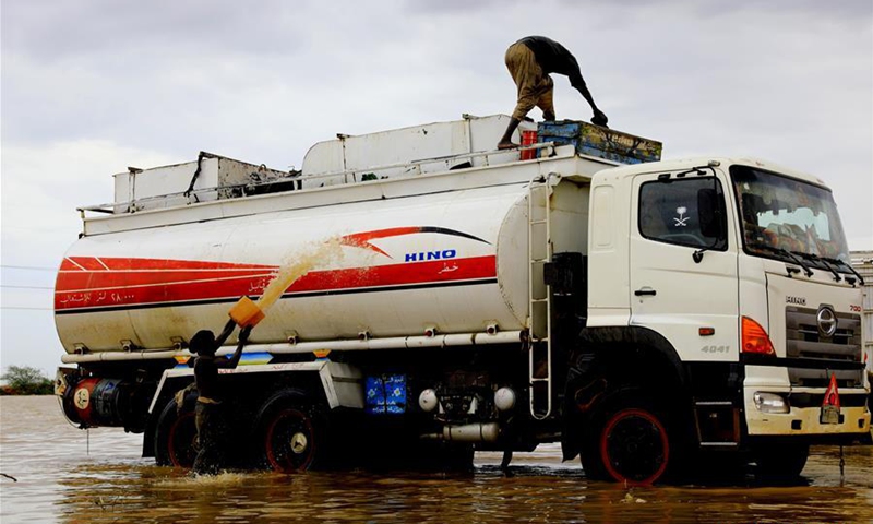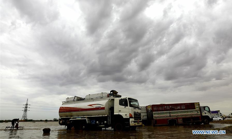Sudanese citizens wash their vehicle in a flooded area near the bank of the White Nile in Khartoum, Sudan, on Aug. 17, 2020. A total of 63 people have been killed due to the torrential rains hit Sudan, the country's National Council for Civil Defense said on Sunday. (Photo by Mohamed Khidir/Xinhua)