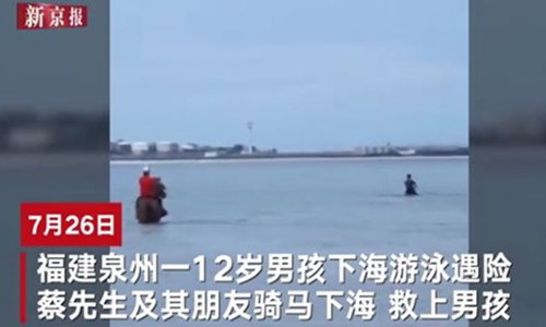 Cai and two of his friends saved the boy on July 26, when they were riding horses along the beach in Jinjiang, Southeast China's Fujian Province. They heard a woman crying for help, saying that her son was being swept away by the ebbing tide. Cai and his friends immediately rode into the sea and managed to bring the drowning boy to the shore.