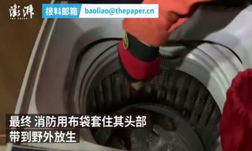 Firefighters in Hangzhou, East China's Zhejiang Province, extricates a weasel from a washing machine. Photo: Screenshot of a video posted by The Paper on Weibo