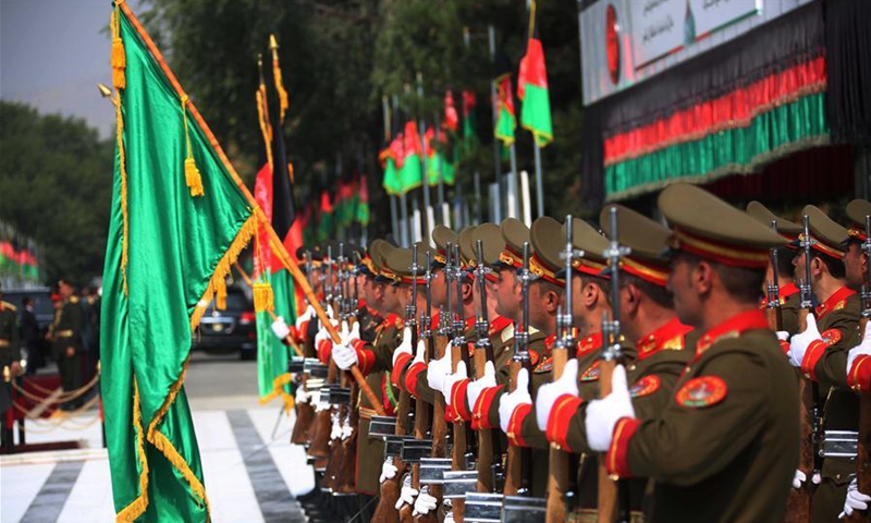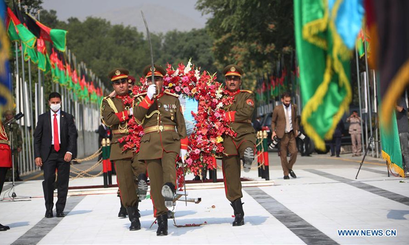 An honor guard takes part in the celebration marking the 101st anniversary of the country's Independence Day in Kabul, capital of Afghanistan, Aug. 18, 2020. Afghanistan on Tuesday marked the 101st anniversary of its independence from the British occupation amid the worsening security situation. (Photo by Rahmatullah Alizadah/Xinhua)
