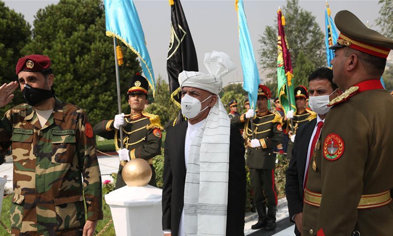 Afghan President Mohammad Ashraf Ghani (C) attends the celebration marking the 101st anniversary of the country's Independence Day in Kabul, capital of Afghanistan, Aug. 18, 2020. Afghanistan on Tuesday marked the 101st anniversary of its independence from the British occupation amid the worsening security situation. (Photo by Rahmatullah Alizadah/Xinhua)
