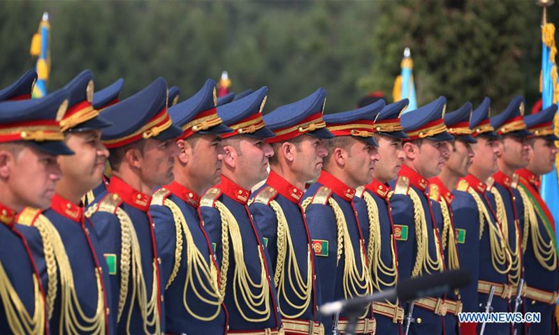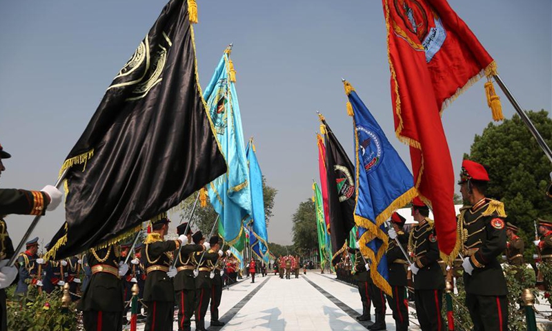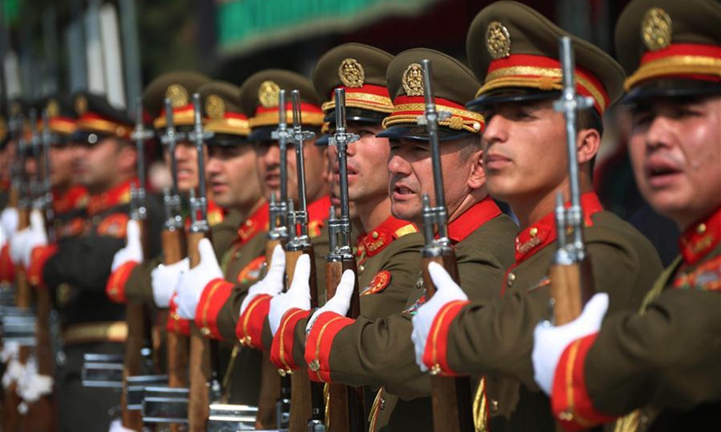Honor guards take part in the celebration marking the 101st anniversary of the country's Independence Day in Kabul, capital of Afghanistan, Aug. 18, 2020. Afghanistan on Tuesday marked the 101st anniversary of its independence from the British occupation amid the worsening security situation. (Photo by Rahmatullah Alizadah/Xinhua)