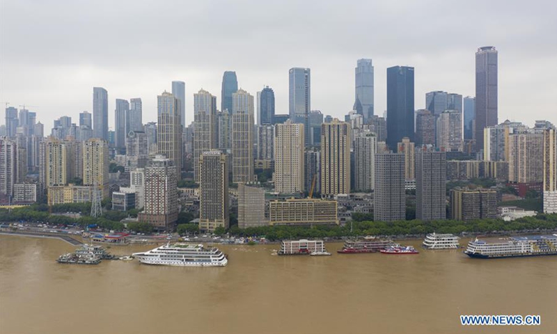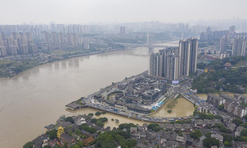 Aerial photo taken on Aug. 18, 2020 shows flooded area in Ciqikou of Shapingba District, southwest China's Chongqing Municipality. Chongqing Municipality, located along the upper reaches of the Yangtze River, was hit by severe flooding on Tuesday. A Level I emergency response was therefore issued for flood control. (Xinhua/Liu Chan)