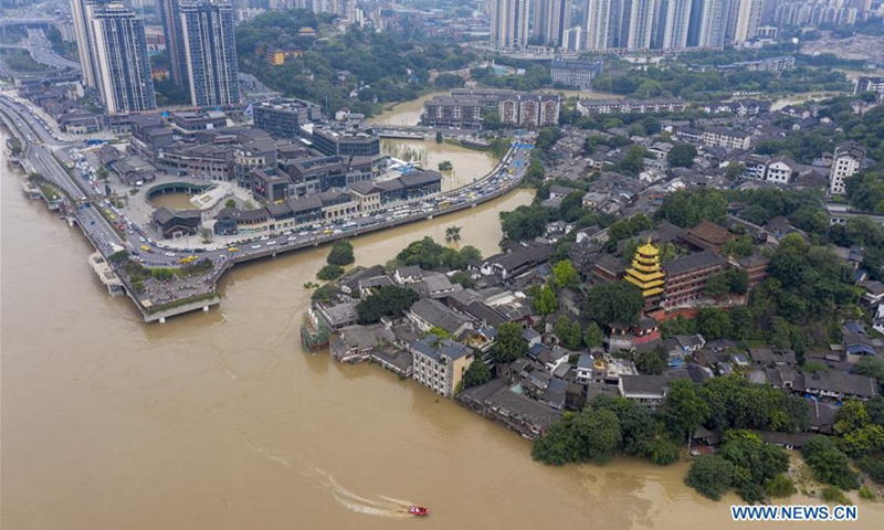 Aerial photo taken on Aug. 18, 2020 shows a rescue boat at the flooded area in Ciqikou of Shapingba District, southwest China's Chongqing Municipality. Chongqing Municipality, located along the upper reaches of the Yangtze River, was hit by severe flooding on Tuesday. A Level I emergency response was therefore issued for flood control. (Xinhua/Liu Chan)
