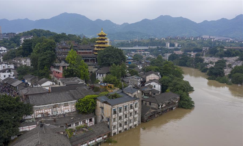 Aerial photo taken on Aug. 18, 2020 shows the flooded area in Ciqikou ancient town of Shapingba District, southwest China's Chongqing Municipality. Chongqing Municipality, located along the upper reaches of the Yangtze River, was hit by severe flooding on Tuesday. A Level I emergency response was therefore issued for flood control. (Xinhua/Liu Chan)