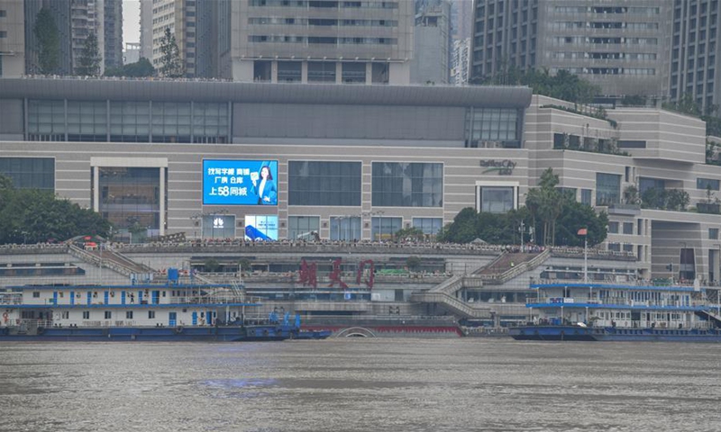 Photo taken on Aug. 18, 2020 shows the flooding water near Chaotianmen Wharf in southwest China's Chongqing Municipality. Chongqing Municipality, located along the upper reaches of the Yangtze River, was hit by severe flooding on Tuesday. A Level I emergency response was therefore issued for flood control. (Xinhua/Liu Chan)