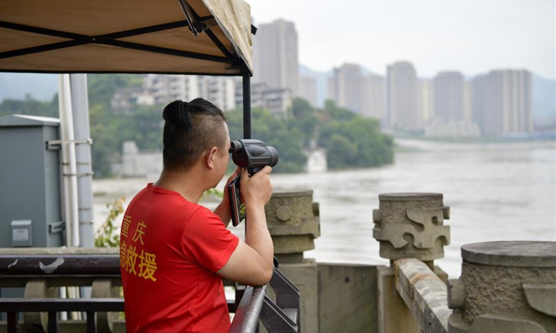 A rescuer is seen on duty near the Ciqikou ancient town in Shapingba District, southwest China's Chongqing Municipality, on Aug. 18, 2020. Chongqing Municipality, located along the upper reaches of the Yangtze River, was hit by severe flooding on Tuesday. A Level I emergency response was therefore issued for flood control. (Xinhua/Liu Chan)