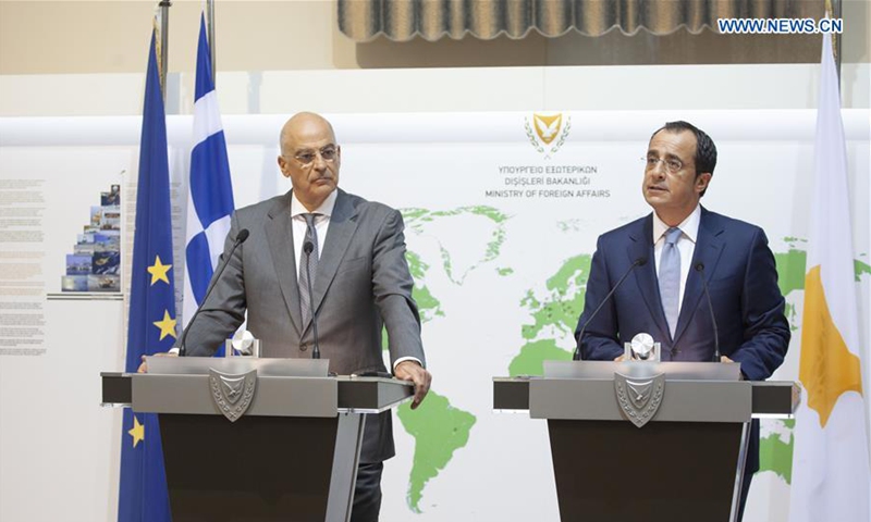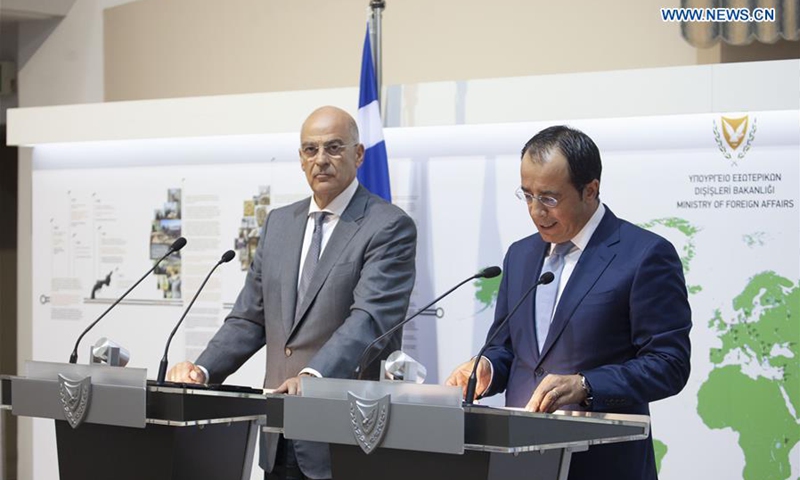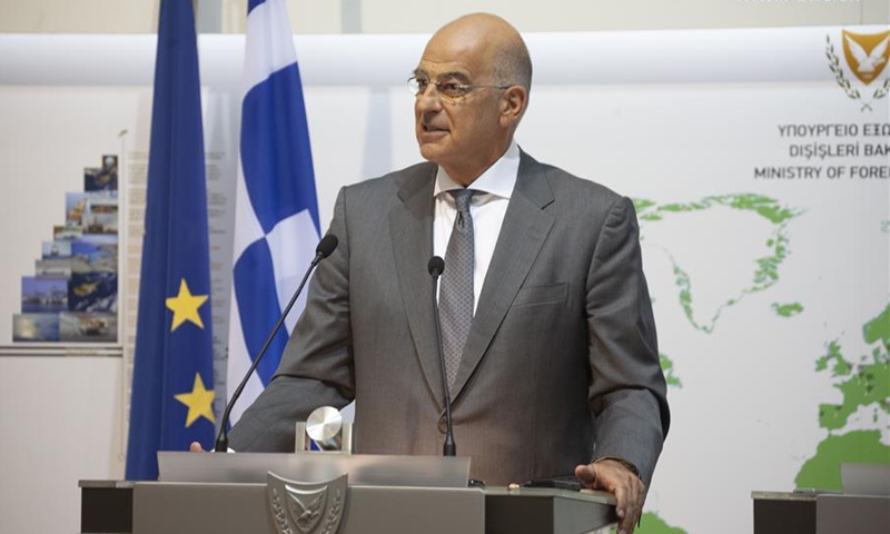 Greek Foreign Minister Nikos Dendias attends a joint press conference with Cypriot Foreign Minister Nikos Christodoulides (not in the picture) in Nicosia, Cyprus, on Aug. 18, 2020. Cyprus and Greece have agreed on joint action at the upcoming EU meetings to deal with Turkish activities in the eastern Mediterranean, which they consider to encroach on their rights, foreign ministers of the two countries said after talks here on Tuesday. (Photo by George Christophorou/Xinhua)
