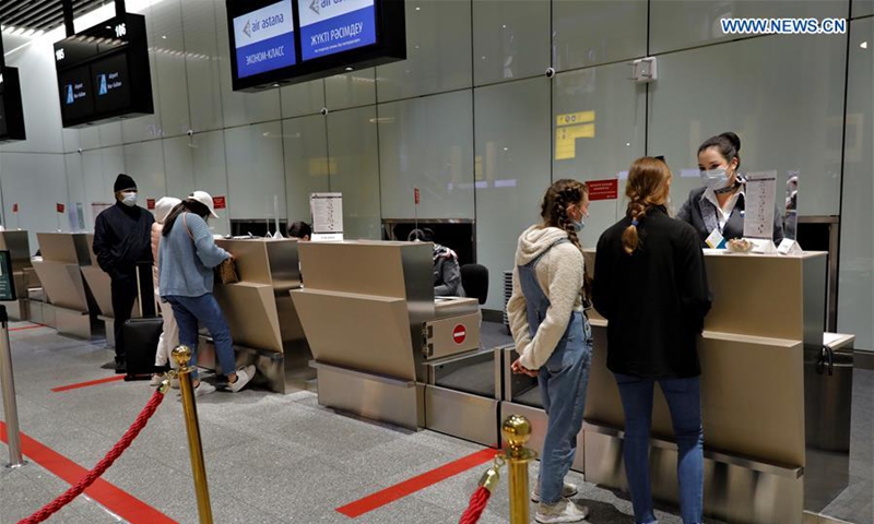 Passengers check in at Nursultan Nazarbayev International Airport in Nur-Sultan, Kazakhstan, Aug. 18, 2020. Kazakhstan has begun resuming flights to the United Arab Emirates, Belarus and Germany, among other nations, local media reported. According to Nursultan Nazarbayev International Airport, a plane from the country's capital to the German city of Frankfurt took off on early Tuesday morning with 94 passengers on board, becoming the first direct flight between Kazakhstan and Germany since March. (Photo by Kalizhan Ospanov/Xinhua)