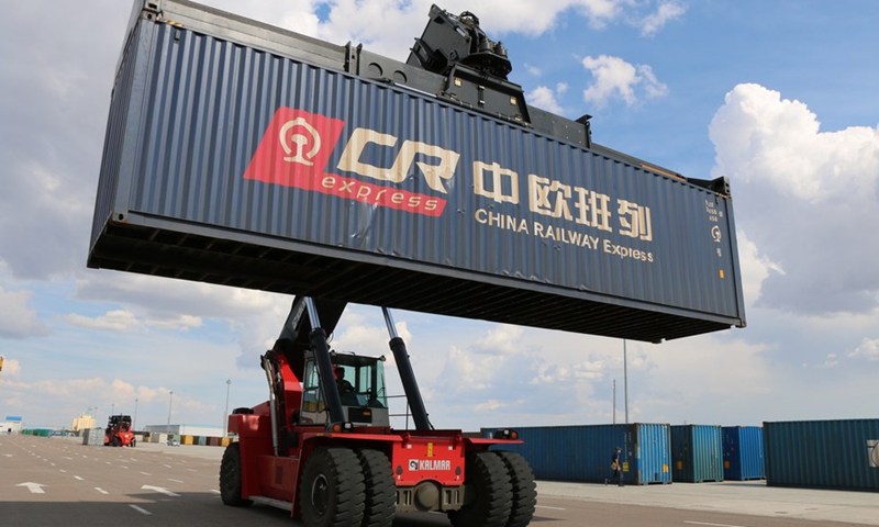 A reach stacker handles cargo containers at the Manzhouli Railway Station in Manzhouli, north China's Inner Mongolia Autonomous Region, July 1, 2020. (Xinhua/Yu Jia)