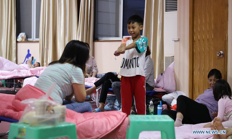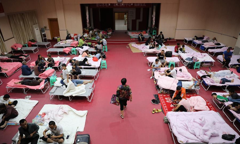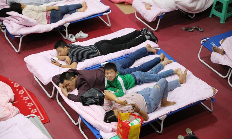 Evacuees stay at a temporary shelter in Bikou Township of Wenxian County, Longnan, northwest China's Gansu Province, Aug. 18, 2020. In the wake of landslides and mountain torrents triggered by torrential rains, many residents in Longnan have been evacuated to temporary shelters set up in safe areas. (Xinhua/Du Zheyu)