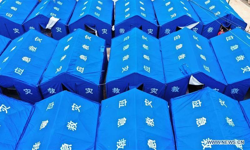 Aerial photo taken on Aug. 18, 2020 shows tents at a temporary shelter in Quanjiawan Village of Wudu District, Longnan, northwest China's Gansu Province. In the wake of landslides and mountain torrents triggered by torrential rains, many residents in Longnan have been evacuated to temporary shelters set up in safe areas. (Xinhua/Chen Bin)