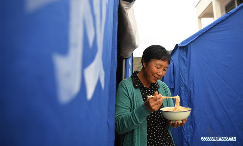 A villager has dinner at a temporary shelter in Quanjiawan Village of Wudu District, Longnan, northwest China's Gansu Province, Aug. 18, 2020. In the wake of landslides and mountain torrents triggered by torrential rains, many residents in Longnan have been evacuated to temporary shelters set up in safe areas. (Xinhua/Chen Bin)