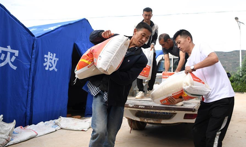 Villagers unload daily necessity supplies at a temporary shelter in Quanjiawan Village of Wudu District, Longnan, northwest China's Gansu Province, Aug. 18, 2020. In the wake of landslides and mountain torrents triggered by torrential rains, many residents in Longnan have been evacuated to temporary shelters set up in safe areas. (Xinhua/Chen Bin)