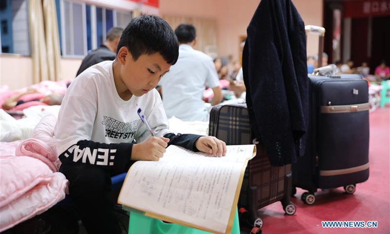 A boy does homework at a temporary shelter in Bikou Township of Wenxian County, Longnan, northwest China's Gansu Province, Aug. 18, 2020. In the wake of landslides and mountain torrents triggered by torrential rains, many residents in Longnan have been evacuated to temporary shelters set up in safe areas. (Xinhua/Du Zheyu)