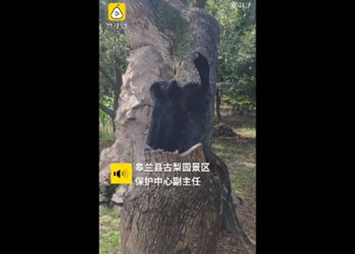 A 407-year old pear tree in Northwest China's Gansu Province that was hollowed out by fire is still full of life and able to bear fruit. Photo: Screenshot of a video posted by Pear Video